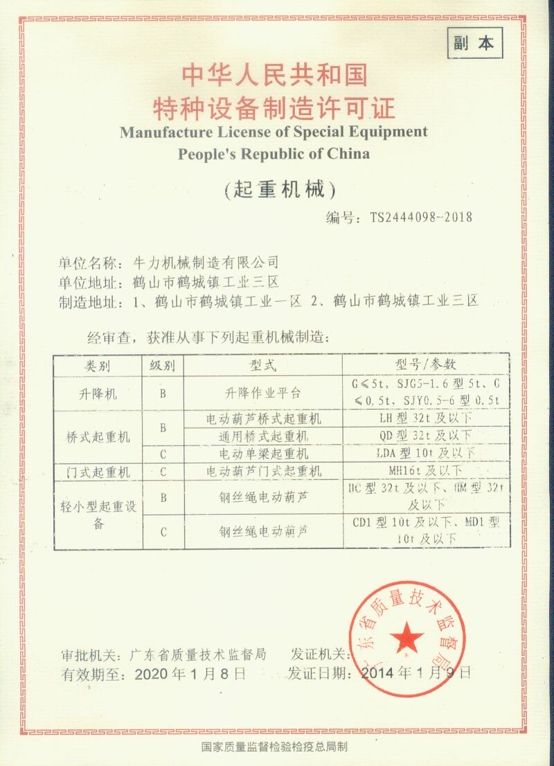• 升降機特種設備生產許可